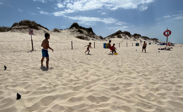 Uma praia de areia infinita entre pinheiros e dunas com vários cafés e restaurantes à escolha acima da praia