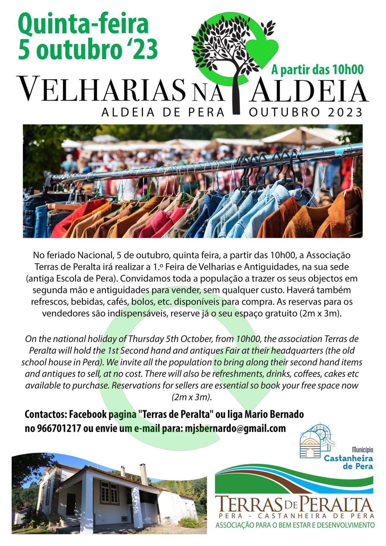 No feriado Nacional, 5 de outubro, quinta feira, a partir das 10h00, a Associação Terras de Peralta irá realizar a 1.º Feira de Velharias e Antiguidades, na sua sede (antiga Escola de Pera). Convidamos toda a população a trazer os seus objectos em segunda mão e antiguidades para vender, sem qualquer custo. Haverá também refrescos, bebidas, cafés, bolos, etc. disponíveis para compra.