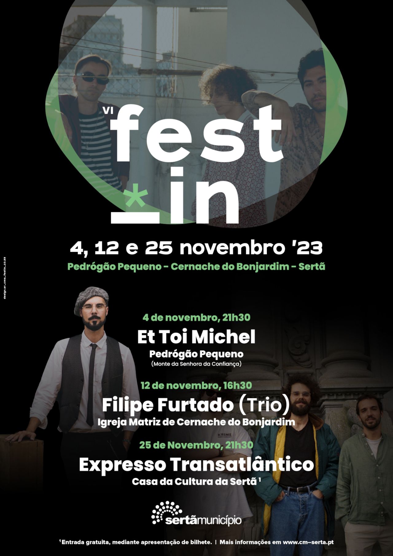 Der Monat November steht im Zeichen der Rückkehr des Fest-In in die Gemeinde Sertã. Bei seinen verschiedenen Ausgaben hat dieses Festival, das bereits ein treues Publikum hat, die besten Kritiken vom Publikum erhalten, das die Qualität der Shows lobt. Die sechste Ausgabe dieses Festivals portugiesischer Bands findet in Hallen (Konzertsäle, Kirchen und andere) statt und führt durch Pedrógão Pequeno (Monte da Senhora da Confiança, das Trägergebäude des Festivals), die Mutterkirche von Cernache do Bonjardim und Casa da Cultura da Sertã. Auf dem Programm stehen Auftritte von Et Toi Michel, Filipe Furtado (Trio) und Expresso Transatlântico. Das von der Stadtverwaltung von Sertã geförderte Fest-In zielt darauf ab, eine intimere Atmosphäre und eine größere Nähe zwischen Band und Publikum zu schaffen.